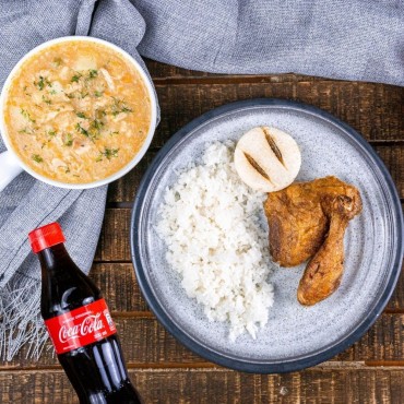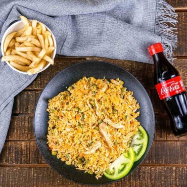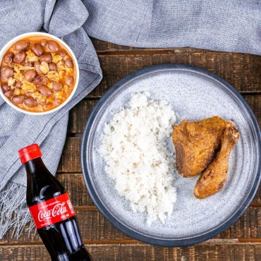 Una porción de arroz con Pollo, papas a la francesa, una gaseosa 10 oz.
