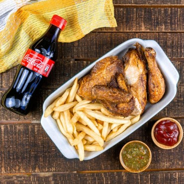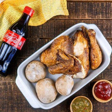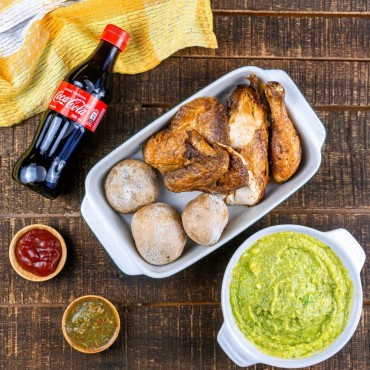 Medio Pollo Tostadito, una porción de papa salada, un guacamole, una gaseosa 10 oz.