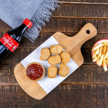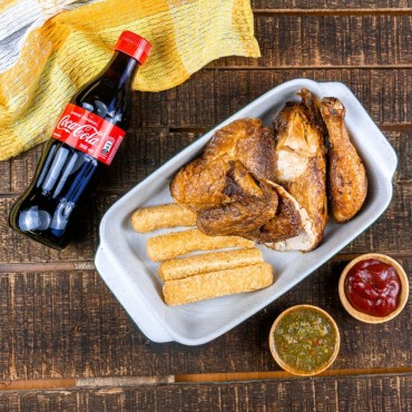 Medio Pollo Tostadito, una porción de croquetas de yuca, una gaseosa 10 oz.