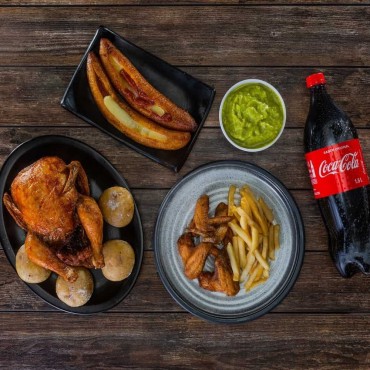 Un pollo tostadito, cuatro alitas BBQ, una porción de papa salada, una porción de papa a la francesa, dos plátanos con queso y bocadillo, una gaseosa 1.5