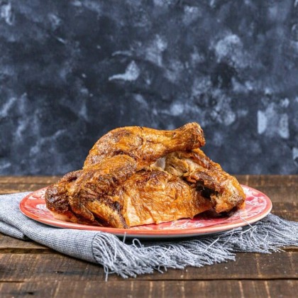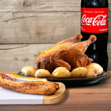 Un Pollo Tostadito, 6 papas saladas, un plátano con queso y bocadillo y una bebida 1.5 litros