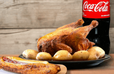 Un Pollo Tostadito, 6 papas saladas, un plátano con queso y bocadillo y una bebida 1.5 litros